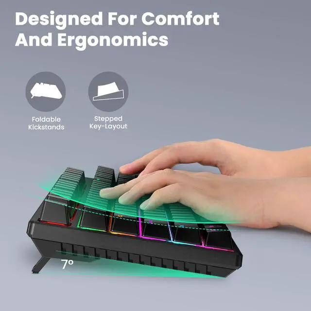 ^^ Ergonomic Comfort Design: Features an adjustable tilt stand and scientifically angled keycaps to effectively reduce wrist fatigue. Maintains natural hand posture even during prolonged use. ^^ Detachable Type-C