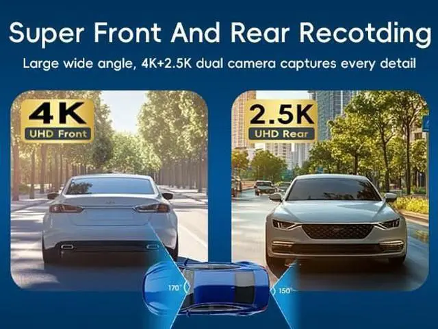 All-in-One Smart Driving CompanionBeyond recording, it's your smart co-pilot. Access videos instantly via the dedicated App over Wi-Fi, control the camera with simple Voice Commands (e. g., "Take photo", "Start recording"), and have your driving route and speed logged accurately with the built-in GPS module. The 10" large touch screen provides a crystal-clear real-time view for safer reversing and monitoring. ^^ 4K Front and 2.5K Rear and Voice ControlWhen set to front and rear dual recording mode, the rearview mirror camera provides a 4K resolution front camera and a 2.5K rear camera.