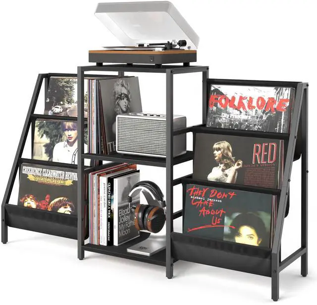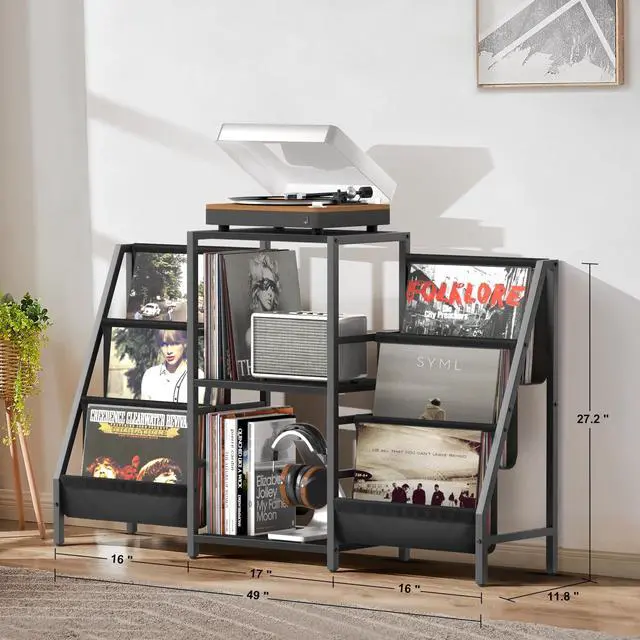 Larger-capacity Record Player StandFeaturing spacious 3-layer shelves and 2 vinyl display holders, the storage capacity of the record player table is double others. It offers a stylish spot to play/organize your record players, speakers, records, books, magazines, albums, media equipment and more. ^^ Turntable Stand with 2 Record HolderTwo stylish record display storage racks have totally 6-tier vinyl shelf storage spaces. The whole record stand can hold over 200 records. Its convenient to find out records and provides a browsing experience that feels like youre in a record shop.