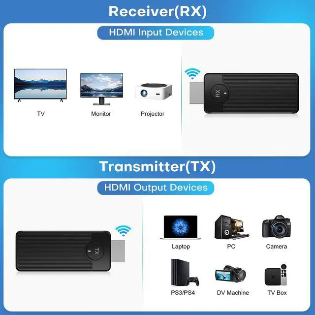 Built-in Antenna: Our Wireless HDMI transmitter and receiver adopts the latest dual-band 5G WiFi transmission chip, while using a compact appearance while retaining the core technology, the internal antenna design to ensure stable and low-latency transmission of video or audio. It has a maximum transmission distance of up to 165ft/50m, but the effective distance may be reduced to 50ft/15m if there are walls or obstacles in the way. ^^ Zero-configuration Wireless