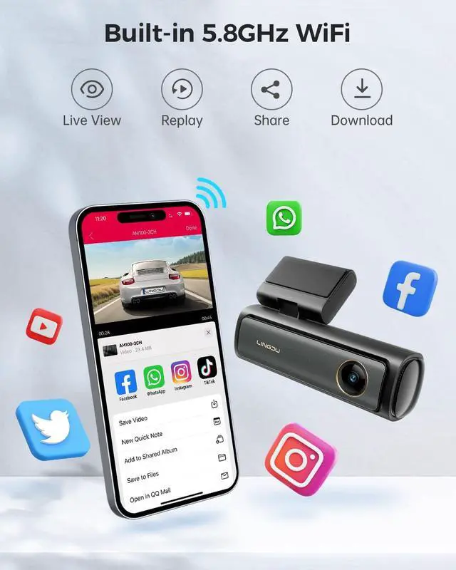 WIFI: LINGDU 3 channel dash cam could be connected to smartphone via LINGDU App. User could play the recorded video by using 5GHz WIFI.