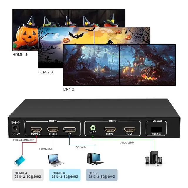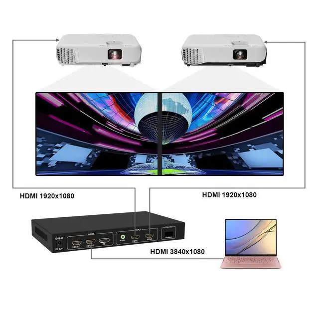 ^^ Signal ResolutionSupport 1 HDMI 1.4, l DP 1.2 signal input. HDMI 2.0 ports maximum support 3840x2160@60HZ resolution and refresh rates of the HDMI signal input; Supports both 1 channel DP 1.2 signal input, maximum resolution up to 3840x2160@60HZ, When 1x2 mode choose 3840x1080/60HZ as resolution will no stretching. ^^ Output ResolutionSupport HDMI 1.3 Signal Output With Resolution 1920x1080@60HZ Each display or Monitors, 1x2 mode means Horizontal screenx2 verticalx1, You will get 3840x1080@60HZ The Whole Resolution. ^^ Stable OperationPure Hardware frame, no CPU, no Memory, System Stability, no Crashes, no System Crashes, no Virus Infection Risk; It Can Keep working 24 hours the Whole day or 365 days The Whole Year.