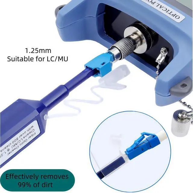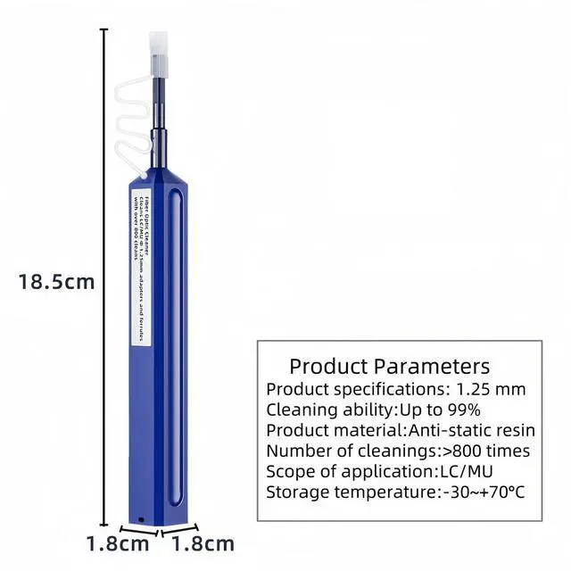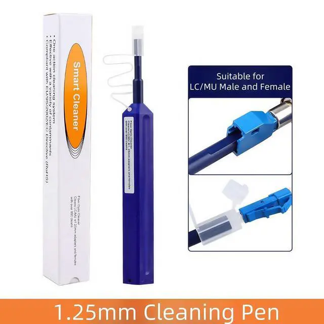 There will be a "click" sound when the cleaning is complete. ^^ MaterialMade of anti-static resin, effectively reduce the loss of the end face of the optical fiber. ^^ ApplicationOur Fiber Optic Cleaing Pen Suitable for cleaning 1.25 mm LC/MU connectors.