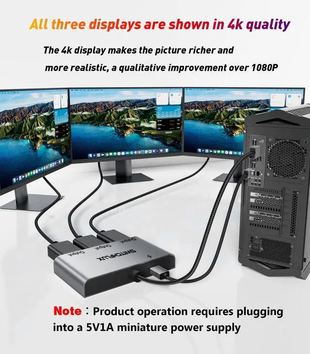 (Note: Be sure to connect the Micro USB cable for best display results. Do not use with any docking/hub/KVM. Only supports from a DP source device to a DP display device. Unidirectional) ^^ 4K UHD Resolution/Audio & Video Sync TransmissionSWITCHFLUX SisplayPort splitter for 3 monitorsSupports HDCP 2.2, single DP screen resolution up to 4K@60Hz, dual DP screen resolution up to 4K@60/30Hz. backward compatible with 2K@120Hz/60Hz and 1080P@120hz/60Hz (Note: To achieve 4K resolution, make sure that the input device ports are at a minimum of DP version 1.2, and that the output ports of the source device support DP/ DP++/DisplayPort++) ^^ Extended/Mirror DisplayPlug and PlayDisplayPort Male to DisplayPort Female splitter is fully plug and play, no driver installation required. Immediately mirrors/extends the DP signal from the source device to two or more DP monitors without any loss, allowing you to enjoy a clearer and larger display.