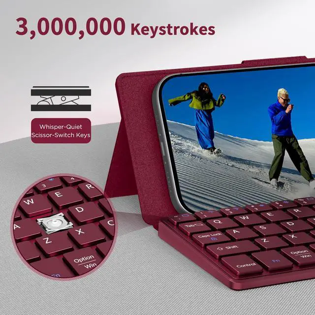 CACOE Wireless Keyboard with Stand, Mini Keyboard for Cell Phone, Ultra-Slim Portable, Foldable, Dual-Channel QWERTY with Stand Holder for Smartphone and More iOS Android Windows, Wine Red