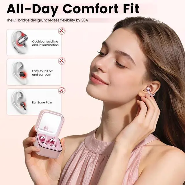 One earbud can last 7-8 hours per charge. A 10-minute quick charge fuels 2 hours of play. From sunrise commutes to late-night gaming marathonskeep the beats going. ^^ Waterproof & Sweat ProofBuilt with nano-coating technology and rigid seams, these open ear headphones withstand heavy rain, sweat, and dust. Ideal for intense gym sessions, trail running, or outdoor adventuresno worries about damage from extreme conditions. ^^ Comfortable and StableOpen-ear clip design for all-day comfort, designed with a gentle, secure clip-on fit that rests comfortably around your earsno ear canal pressure or fatigue.