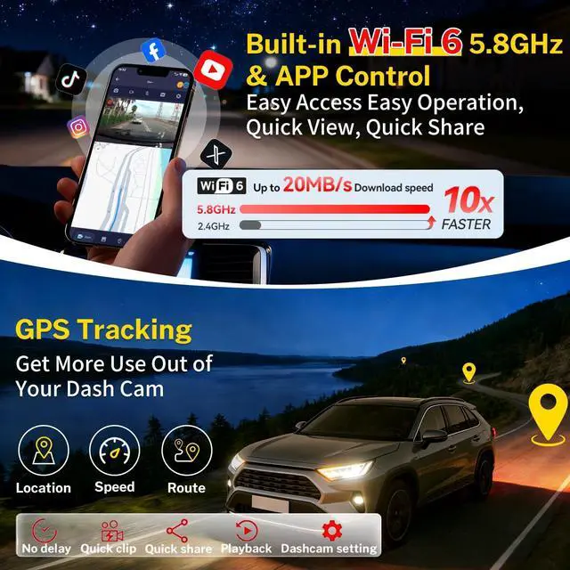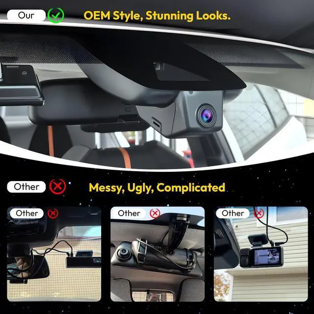 installation Please note: this product is not compatible with other models ^^ Loop Recording & GPSWhen the memory card is full, it will gradually overwrite the oldest videos while preserving the latest recordings. Additionally, emergency footage (e. g., from collisions) is automatically locked to ensure your important videos are never lost. Additionally, the GPS function can be manually activated to record real-time vehicle speed, driving routes, and precise map informationmaking it particularly suitable for accident evidence collection ^^ Built-in 5.8GH z WiFi & Smart App Connect your smartphone to the dashcams built-in 5.8GH z WiFi to enjoy ultra-fast downloads up to 20MB/s. Using Mobile appyou can preview, download, and replay videos in real time, check GPS ata (route, speed, and location), and manage settings effortlessly, making it simple to review footage and share important moments ^^ 4K (3840*2160p) Resolution with HDREngineered with an f/ 1.6 aperture lens and a high-sensitivity CMOS sensor, this 4K integrated dash cam captures ultra-sharp 2160P video at 30fps so detailed that even fast-moving license plates stay readable. With HDR technology, it balances light and shadow intelligently, delivering vibrant, well-defined footage even in challenging low-light conditions.