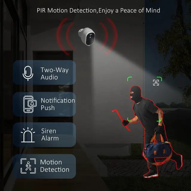 & Two storage methods: Record securely with the Tuya App for cloud-based storage (subscription required), which also offers features like person, package, pet, and vehicle detection. Alternatively, capture footage locally by inserting a microSD card (up to 128GB, sold separately) into the outdoor camera. ^^ Custom Delineated Area & Alexa and Google AssistantOur wireless outdoor camera features advanced AI that swiftly detects moving objects and sends alerts to your phone. With the app, you can define monitoring areas to minimize false alarms, ensuring alerts are reserved for genuine threats. Plus, it's compatible with Alexa and Google Assistant for hands-free control ^^ Wire-Free & IP65 WaterproofThis Outdoor battery camera is completely wireless, with no power cords or network cables needed. It comes with a built-in 5200mAh large-capacity rechargeable battery, providing worry-free use for months on a single charge. With an IP65 Waterproof, this security camera is built to withstand various weather conditions, making it an ideal choice for outdoor installations.