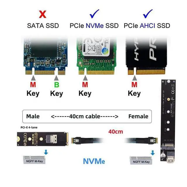 Key M (Pins 59-66 Notched), Primary Interfaces PCIe x4 (main interface for high-performance NVMe SSDs); Common Applications High-performance NVMe SSDs; Modules can be 22mm wide and various lengths. ^^ The product included two PCBA and one cable. The cable is 40cm length and included SFF-8654 Connector; The two PCBA and one cable must be connect together. ^^ Support NVME extension only, it can't convert NVME to SFF-8654, also can't convert SFF-8654 to NVME; Extend the NVME from 2242/2260/2280 socket to 2230/2240/2260/2280/22110 cable. ^^ Built-in Flexible Soft cable