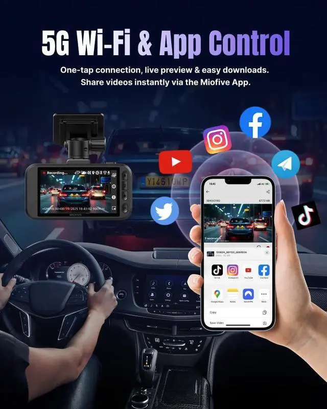 Dual Channel 4K + 2.5K Recording Capture sharp, detailed footage with the front camera at 4K resolution and a 140 wide-angle lens, plus the rear camera at 2.5K resolution and a 115 wide-angle view. HDR technology and enhanced super night vision ensure clear images in low-light conditions. ^^ Built-in GPS & 5GHz / 2.4GH z WiFi with App Control Easily connect with both Android and iOS devices via the Miofive app. View, download and share footage from your phone. GPS records your vehicles speed, route and location for added evidence. ^^ Automatic Event Locking & Loop Recording Loop recording ensures you never run out of storage; the built-in G-sensor detects a collision or sudden impact and automatically locks the file to prevent overwriting.