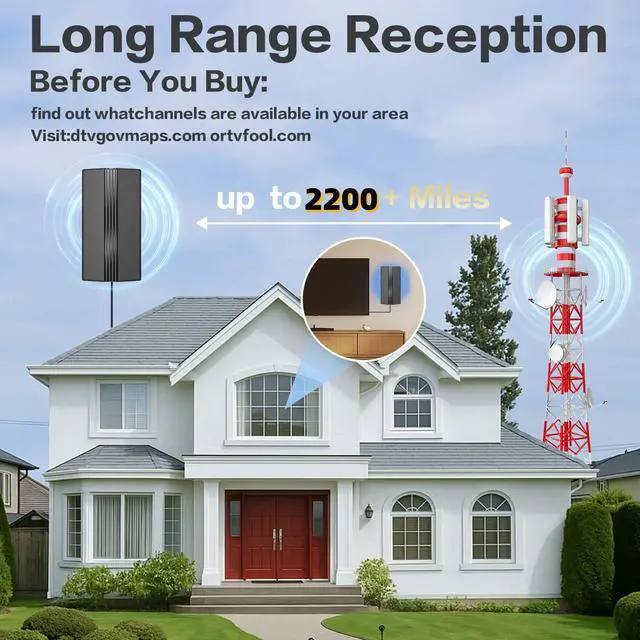 : This TV antenna offers an impressive 2200+ miles range, providing clear and stable reception for local channels. Whether youre using it as a TV antenna indoor or outdoor, it ensures excellent signal reception, making it perfect for smart TV and all TV types.