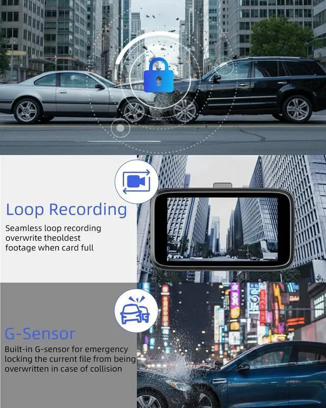Note: For continuous recording, please use the original car charger, and a hardwire kit is required for power supply ^^ [Loop Recording & G-Sensor Dash Cam] --- The loop recording function automatically overwrites the oldest videos once storage is full, ensuring the memory card (not included) never runs out of space. The built-in adjustable G-sensor detects sudden impacts or collisions, locking and securing important HD footage as evidence.