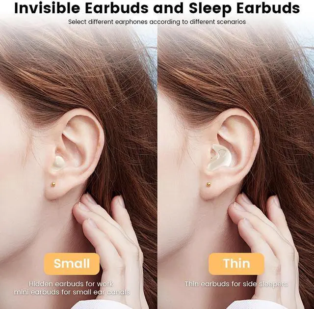 2-IN-1 DUAL SLEEP EARBUDS SET - Includes two different styles of ultra-soft, skin-tone earbuds in one charging case. Experience both low-profile and in-ear designs tailored for side sleepers, small ears, and all-night comfort. ^^ INVISIBLE & DISCREET DESIGN Ultra-thin, micro earbuds sit flush in your ear for undetectable wear. Perfect for sleeping, working, or gym use without drawing attention. ^^ NOISE-REDUCING & CLEAR SOUND Our soft ear tips form a gentle seal to reduce ambient noise for better sleep, while delivering clear audio for meditation, podcasts, or calls.