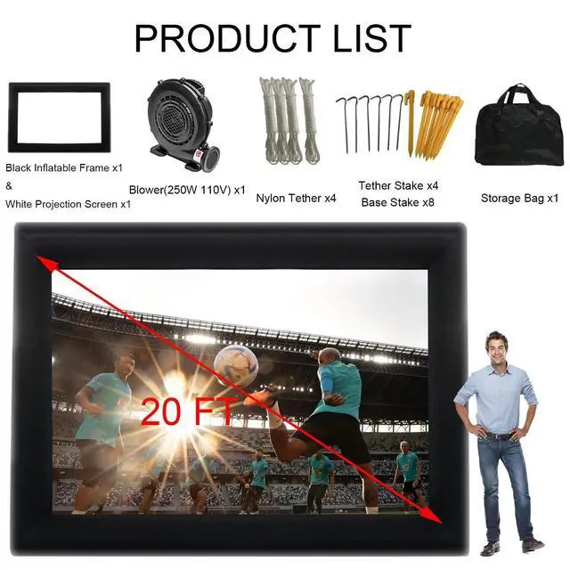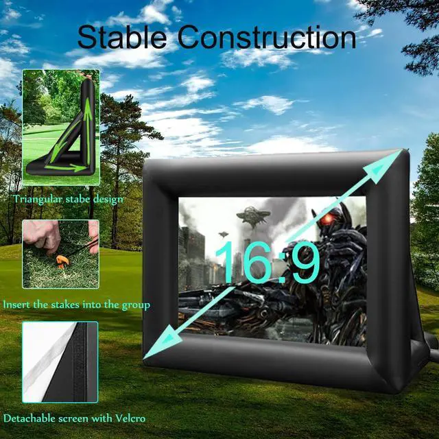 Movable TheaterOnce buying this portable inflatable projector screen is meaning that you own a cinema which can be moved. Ideal for watching movies or videos and playing games with your family and friends outside during camping, picnic, wedding, party, pool fun, and so on. ^^ Support Front & Rear ProjectionThis inflatable movie screen allows front and rear projection with a 160 wide viewing angle, 16:9 screen ratio, and high color reproduction allowing for greater flexibility. ^^ Easy to Set UpThis 14 feet inflatable movie screen can be installed in minutes.