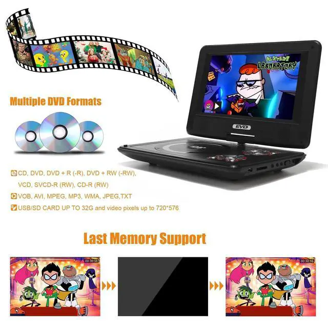 3 Optional Charging Modes SQQBZZ portable DVD players support 5-hours video watching. It also comes with an extra 1.8 m AC charger and car charger, you can use it while charging so that It will be very convenient to play videos at home or in your car. ^^ SUPPORTS HUGE ARRAY OF MULTIMEDIASupports direct play of CD, DVD, CD-R/RW, DVD -R/+R, DVD+RW/-RW, VCD, SVCD (but not blu-ray DVD). It is region free. ^^ Excellent Visual Experience 9.5" SQQBZZ portable DVD player has eye protection screen 270 rotation and 180 filp, the resolution can reach 800*480, the body is compact and easy to carry, placed on the car seat fits perfectly, giving you an excellent visual experience.