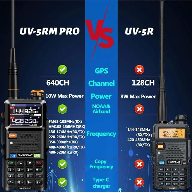 Professional Ham Radio: BAOFENG UV-5RM PRO radio has a wide frequency range, meeting the needs of different environments and achieving the best reception effect, it also supports FM radio and AM aviation functions. With up to 640 storage channels and an ergonomic design, the BAOFENG 5RM PRO provides enhanced comfort and convenience for all levels of users. UV-5RM PRO with GPS, but without flashlight. Other functions are the same to UV-5RM.