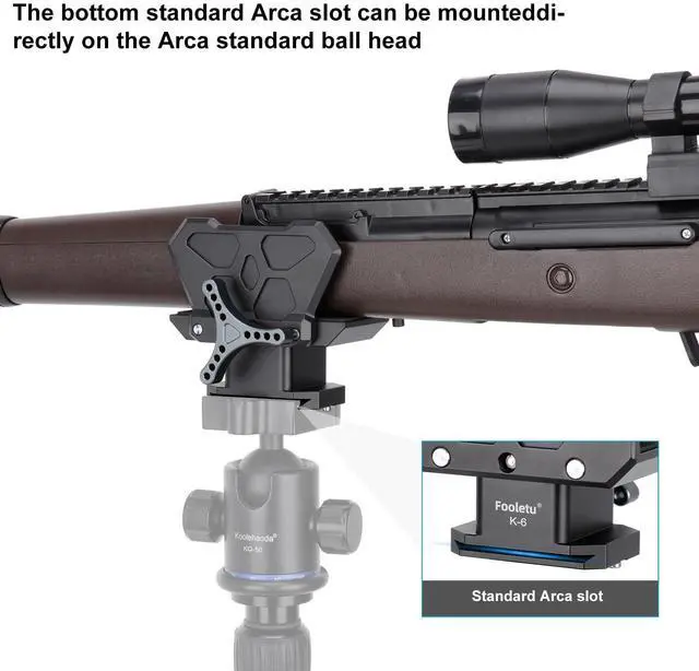 The main body and the knob of the rest head are CNC machined from high quality solid aluminum block. with hard-anodized finish ensures it's resistant to corrosion and abrasion, built to last, Ideal to work outdoors under extremely harsh environment. This innovative design not only provides a secure hold but also allows for hands-free use, offering unparalleled convenience during your shooting sessions. ^^ The adjustable clamp accommodates a working width range of 1.7 to 3 inches, fitting most firearms, ensuring stability with no wobbling. ^^ Base of the saddle is Arca standard QR plate to be mounted on Arca standard ballhead directly; Safety stop screws avoid dropping from the ballhead by powerful shock.