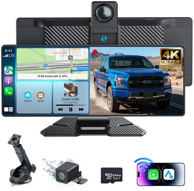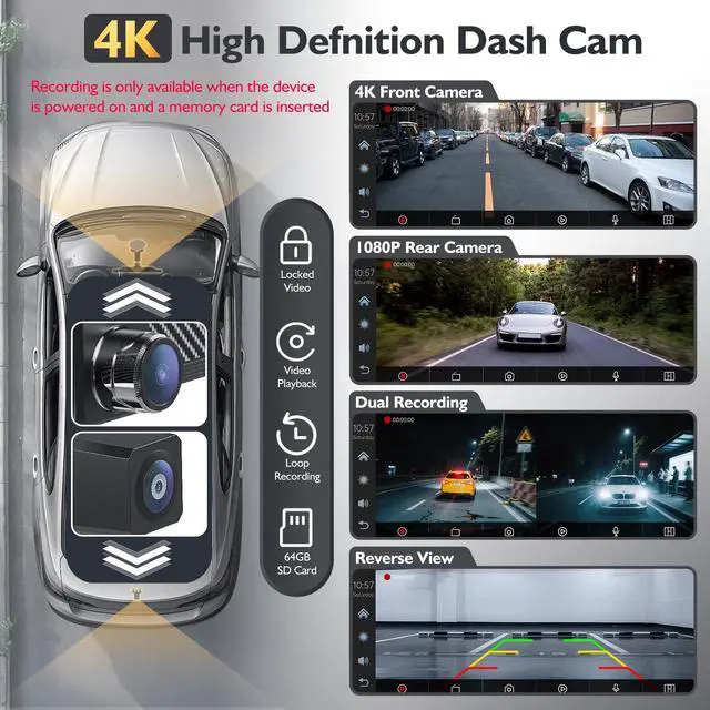 Stay focused with Apple CarPlay & Android Auto support for hands-free real-time GPS navigation, voice guidance, and real-time traffic updates. Drive smarter, stay connected, and stay focused on the road ahead. ^^ 4K Front + 1080p Rear Dual Cameras Car stereo comes with a 4K front dashcam and a 1080p HD backup camera (activates automatically when reversing), this stereo system captures every detail on the road. Features include loop recording with a lock function to secure important footage. The 170 wide-angle rear camera offers adjustable parking lines, night vision, and a waterproof designensuring clear visibility and safer reversing in all weather conditions.