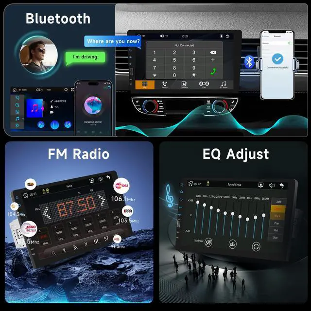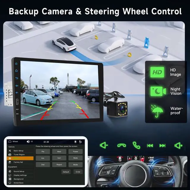 ^^ Bluetooth 5.0 and FM radio and EQSingle Din Car Stereo with bluetooth 5.0, support hands-free answering and making calls, playing music intelligently. This car audio receivers supports FM radio, with 18 preset stations, you can listen to real-time traffic, news broadcasts, weather forecasts etc. Support multiple EQ modes, treble and bass can be adjusted. ^^ Rear View Camera Input1 DIN Car stereo with backup camera, with easy operation rear-view camera, when the vehicle shifts into reversethe car radio screen will automatically display the reverse image, when parking finishes, it will return to radio page ^^ Steering Wheel Control9'' Single din touchscreen radio support steering wheel button learning function, through it you can control the functions that you need by steering wheel, more convenient.