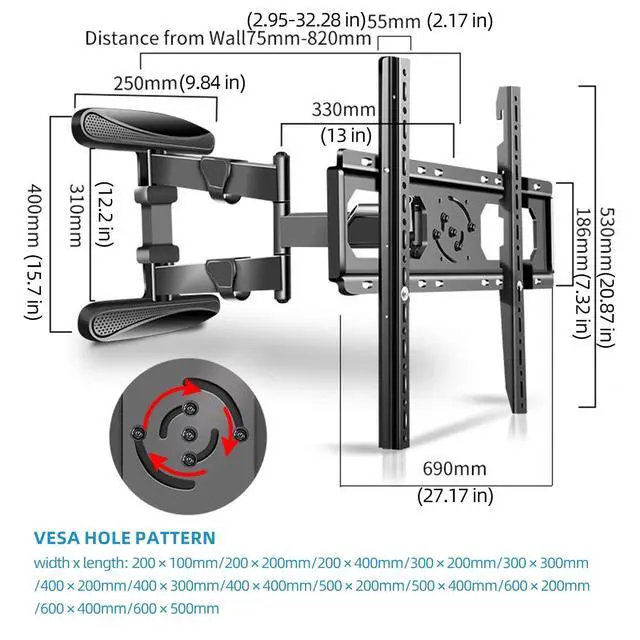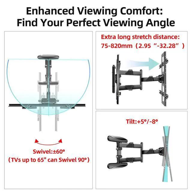 Full Motion More Comfortable: The 32.28 "long articulated arm allows you to maximize your viewing angle from various corners of multiple rooms. It can rotate 90 according to your seat, displaying the screen on the left or right side (note: the maximum rotation angle depends on the screen size. For TVs under 65 inches, it can rotate 90 ). Simultaneously supporting up and down tilt of+5 ~-8 effectively reduces glare. It is perfect for your home entertainment and office ^^