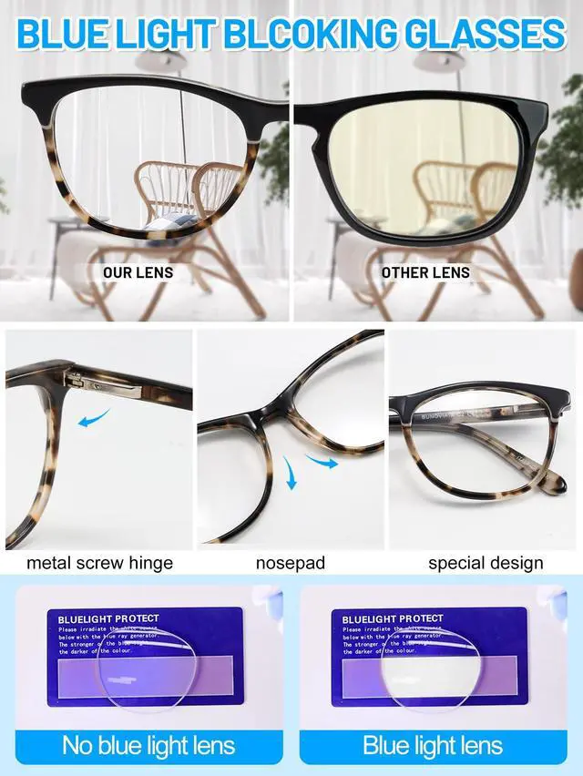 ^^ High definition lenses: Blue light lenses wont distort text or images, so you can read emails, edit photos, or watch videos clearly without squinting. Use the womens blue light glasses to protect your eyes, especially fit for anyone sitting at the computer for long time. Enjoy the digital time. ^^ Lightweight & Comfortable for All-Day Wear Made with super-light frames that wont press on your nose or ears, even if you wear them 8+ hours at work. Soft, flexible temple tips stay in place without slipping (great for moving between desks and couches) and avoid leaving red marks. Ideal for busy days of typing, video calls, or online shopping.