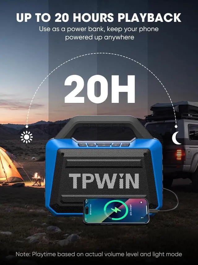 ^^ 20H Playtime & Power BankTPWIN wireless speaker equipped with a 10000 mAh high-capacity battery, without frequent recharging and meets your music playback needs for a whole day. You can use this wireless speakers with bluetooth as power bank, keep your phone powered up wherever you are. (Playtime based on actual volume level and light mode. ) ^^ TWS Surround & Light ShowBlue tooth speaker supports TWS functionality, allowing you to pair two speakers for a powerful immersive spatial audio experience. Stereo surround sound opens a 360-degree music illusion. Party speaker offers a rich visual experience with 6 captivating light modes and 10 vibrant light colors.