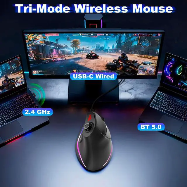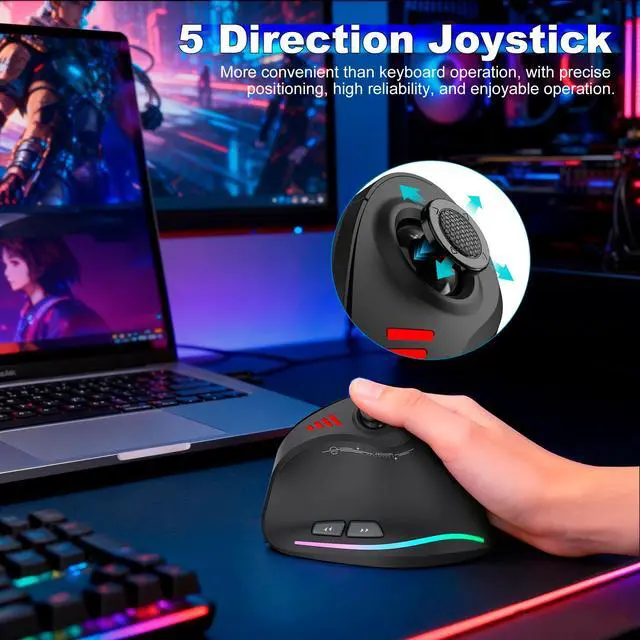 (Note: You can't control 2 devices at the same time. ) ^^ Ergonomic Vertical MouseThis vertical mouse bases on ergonomics, effectively reducing users wrist strain and muscle pain by a natural handshake griping way. An optimal healer for wrist pain, shoulder fatigue, Carpal Tunnel Syndrome and tendinitis.