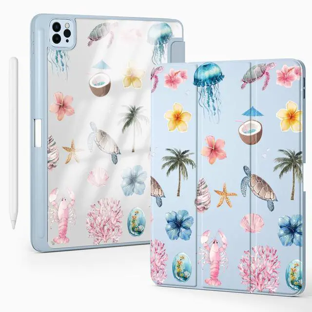 BlHMCASE Cute Sea Turtle Flower Palm Tree for iPad (A16) 11th Gen Case 11 Inch 2025, for iPad 10th Gen Case 10.9 Inch 2022 with Pencil Holder, Auto Sleep/Wake, Blue Leather Clear Acrylic Back Cover