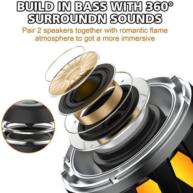 LED flame show: The light button in the middle of the outdoor bluetooth speakers which can show 2 different lighting modes. In flickering flame light mode, the natural and realistic dancing flames form a lively campfire atmosphere. In night light mode, the breathing light creates a romantic atmosphere and helps users fall asleep faster. it adds 360 illumination to your space. Warm light makes LED flame speakers nice for Christmas decorations. ^^