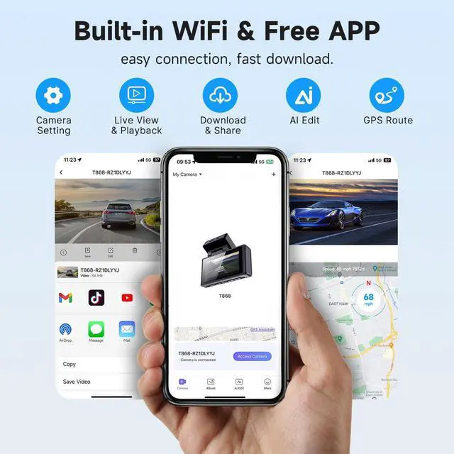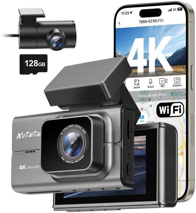 Rear Dash Cam: KuTaiTai dash camera for cars captures every detail with stunning 4K front and 2K rear video. Dual 170 ultra-wide front and rear angle minimize blind spots. Equipped with the advanced full-color starlight night vision, F 1.6 large aperture, 6-layer optical lens and WDR&HDR technology, ensures sharp night vision and crisp details day or night. ^^ Ultra-Fast WiFi & Free App Control: With the faster built-in WiFi, you can use the "Viidure" car dash cam app to preview, download, and replay videos in real time, check GPS ata (route, speed, and location), and manage settings effortlessly, making it simple to review footage and share important moments, or retrieve vital evidence after an accident. ^^ Car Camera with GPS & 3"