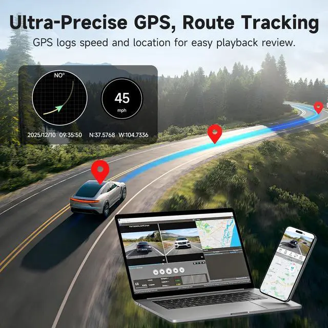 Touch Screen: The dash camera front and rear is equipped with a state-of-the-art Tri-Mode GPS module that supports 3 satellite positioning systems: GPS, BEIDOU, and GLONASS, automatically logs real-time driving dataincluding location, speed, and route history, it can be viewed and operated on the 3" IPS Touch screen. ^^ Loop Recording & Free 128GB