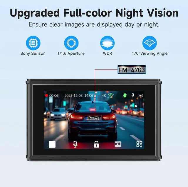 Card: The 4K dash camera for cars supports seamless loop recording to ensure continuous coverage without interruption. Older files are automatically overwritten when storage is full, while important events are safely locked. Includes a Free 128GB memory card (supports up to 512GB) ready to use right out of the box. ^^ 24/7