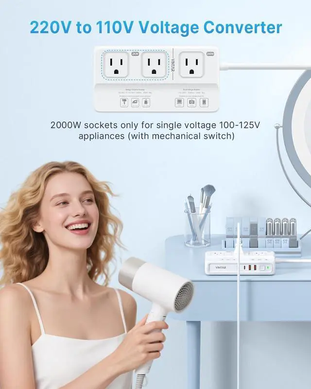Modules Voltage Conversion: The 2000W converter area converts voltage 220-240V (50/60Hz) to US voltage 110V (60Hz) for hair dryers, curling irons and other electrical appliances. The 200W adapter area supports 100-240V dual voltage, suitable for laptops and smartphones, etc ^^ 7 in 1