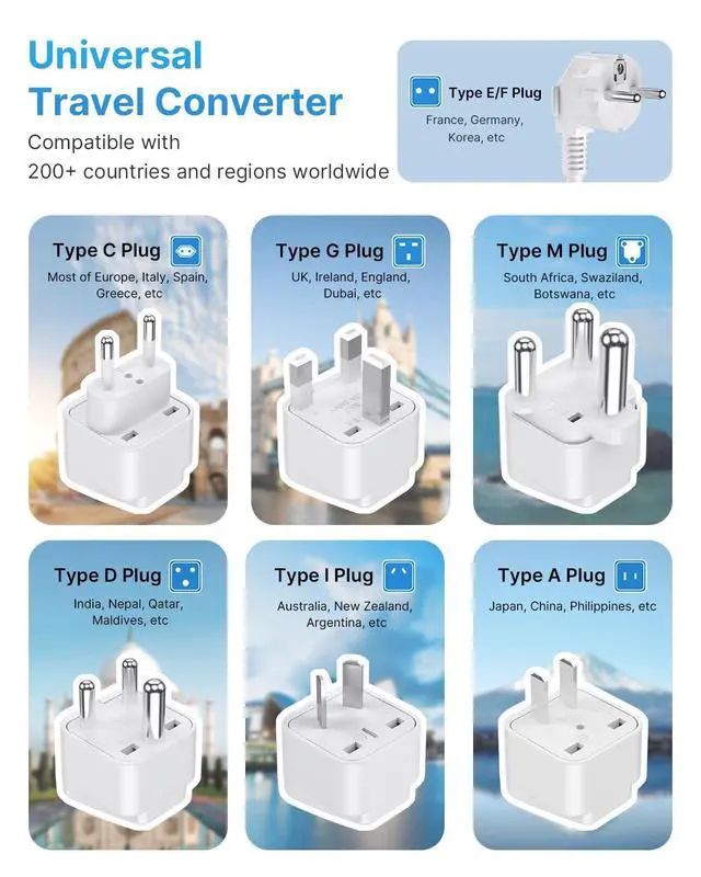 Voltage Converter: The 220V to 110V converter equipped 1 DE power cable and 6 international power adapter plugs (type A, C, D, G, I, M); Power converter adapter combo covers more than 200 countries and regions, such as Europe, UK, Italy, France, Germany, Spain, Greece, Ireland, South Korea, Australia, New Zealand, China, Dubai, India, South Africa and more ^^ Different