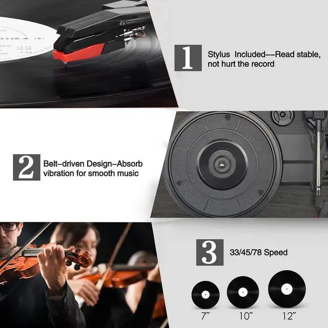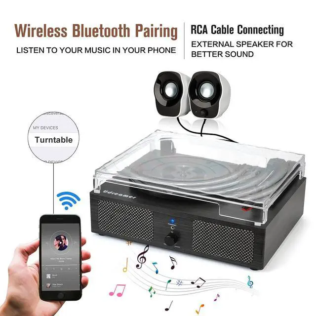 Build in Speakers& RCA Output for External SpeakersThe record player builds in 2 stereo speakers, provides you retro-style sound. You can connect this vinyl record player with external speakers via RCA cable for better or louder sound ^^ 3 Kinds of Turntable InputThis record player designs with 3 input choices: Bluetooth input, USB input and AUX input. You can wireless listen to your phone music via Bluetooth pairing; Use USB function to directly play music; or Play songs on turntable with your 3.5 mm devices like Ipad, CD player ect. ^^ Multiple Vinyl Playback ChoicesThis record player supports 3 speeds: 33 1/3rpm, 45rpm, 78 rpm, play
