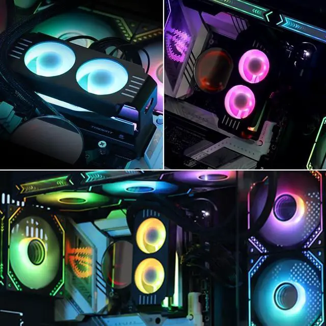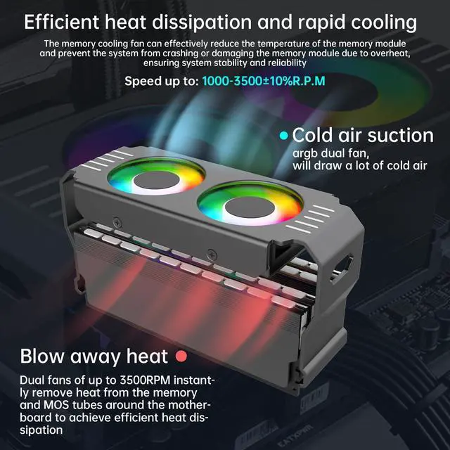 [Memory Module Cooling Fan Effectiveness]argb memory cooler memory cooling fan designed for computer games, size 146*57*71mm ( 5.75 * 2.24 * 2.8 in), support DDR/DDR2/DDR3/DDR4/DDR5 ^^ [5V 3PIN ARGB Synchronized Memory Fan]memory cooling fan is equipped with addressable ARGB LED lights, making your computer case colorful and bringing you the ultimate visual experience ^^ [High Airflow] Dual fan design memory cooler provides high quality and high performance for gaming ^^ [High Quality Material Memory Fan]Made of thick aluminum alloy material, the Argb memory cooler can dissipate heat easily, No Tools Required ^^ [Customer Service]If you have any questions about this product, please feel free to contact us