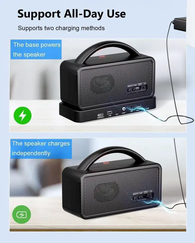 ^^ Support All-Day Use: The Portable TV speaker supports two charging methods, the base powers the speaker or the speaker charges independently. 20 hours of playback at 50% volume on a single charge.