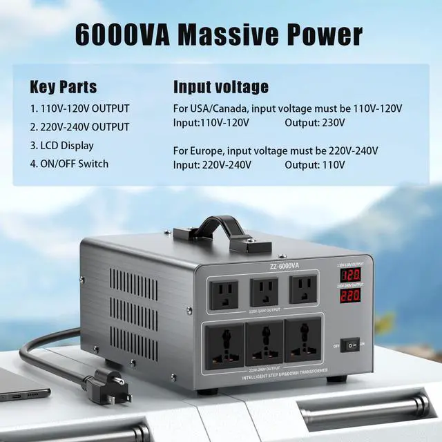 Your Devices: Built-in circuit breaker, overload, overheat, low voltage, and over voltage protection automatically shuts down the unit when risks are detected. Keeps both your transformer and connected appliances safe during operation. ^^ 6 Outlets + LCD Display for