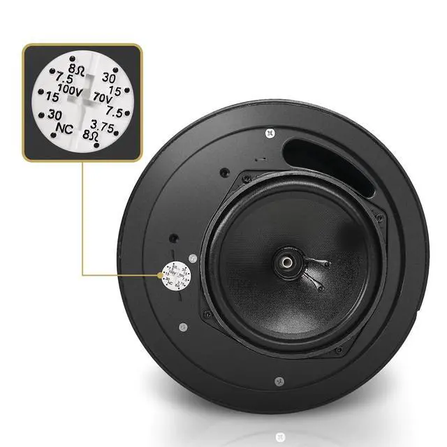 Installation is streamlined and safe, thanks to the included main and safety hanging cables, which facilitate secure ceiling suspension. This setup guarantees stable and optimal positioning, enhancing both safety and sound performance. The speaker's sleek, black finish complements spaces with exposed architectural elements or open ceilings, seamlessly integrating into modern aesthetics. Additionally, the STPDS-65B is highly versatile, featuring a built-in transformer for either 70-volt or 100-volt systems with selectable taps (30W, 15W, 7.5W, 3.75W ), and the ability to operate at 8. This makes it suitable for a wide range of applications, from indoor to outdoor settings, and ideal for both residential and commercial environments.