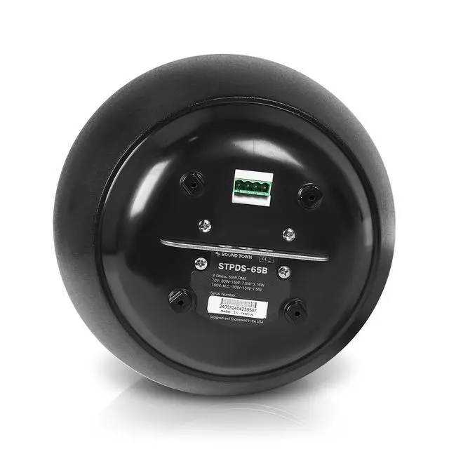 Sound Town 6.5" Weather-resistant Pendant Speaker, 70V/100V/8-Ohm, Indoor/Outdoor Commercial Speaker for Home and Commercial Installation, Black (STPDS-65B)Elevate your audio environment with the Sound Town STPDS-65B IP54-rated pendant speaker. This speaker is equipped with a robust 6.5 -inch woofer and a coaxial 1-inch compression driver, delivering crisp, clear audio with 60W RMS and 120W program power at 8. The wide 120-degree conical coverage angle ensures immersive sound projection, complementing any environment. Built to last, the STPDS-65B boasts an IP54-rated enclosure, making it perfect for outdoor installations and high-humidity environments by effectively protecting against dust and water.