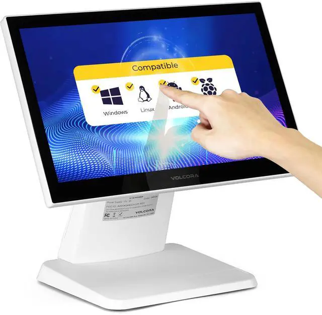 Volcora 15.6" White LED Touch Screen Monitor with Metal Stand - Backlit 1366 * 768 with VGA HDMI Connection for Small Business, Restaurant, Office - No Driver Required (Not Compatible with macOS/iOS)