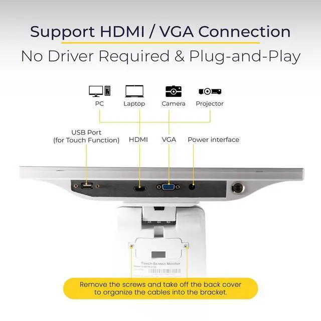 Connectivity: Equipped with HDMI, VGA for video, and USB for touchscreen operation. USB connection required for touch capability. You can connect multiple devices without the need to constantly switch cables.