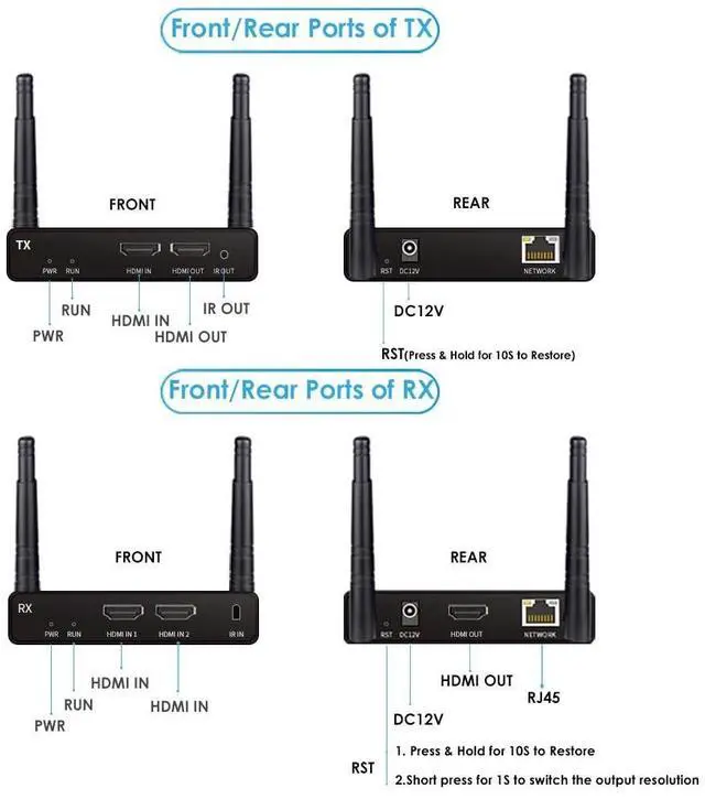 Easily connect to camcorders and other devices for flexible, wireless video transmission. ^^ Long Distance Wireless Transmission Capable of transmitting video wirelessly up to 328ft (100m) in open air environments. Achieve up to 656ft (200m) under rigorous conditions with a wired connection to a switch or router for extended range. ^^ Stable, High-Quality Image Featuring an auto equalization system, this device ensures smooth, stable, and crystal-clear image quality even at long-range transmissions, minimizing signal degradation and providing consistent performance.