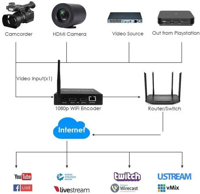 Wi-Fi Network Connectivity - This is a dedicated wireless video encoder that connects directly to your existing Wi-Fi network. It provides a flexible installation solution for transmitting video from any location within your Wi-Fi coverage, eliminating the need for a physical Ethernet cable. ^^ HDTV Input with Loop-Out for Monitoring - Features one HDTV input for your camera or video source and a dedicated HDTV Loop-Output. This allows you to connect a local monitor or display for real-time, pass-through viewing of the original source signal, ensuring video quality and composition. ^^ Core Video Conversion Function - The primary function is to convert the incoming HDTV audio/video signal into a digital feed and transmit it over your Wi-Fi or Ethernet network.