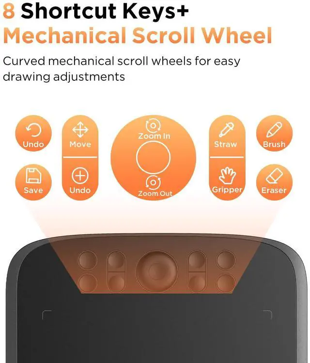 [Scroll Wheel & 8 Hot Keys] The graphic tablet comes with a scroll wheel for adjusting canvas size by default.the drawing pad is equipped with 8 shortcut keys. They are pre-set for accessing commonly used drawing tools such as pen, eraser, brush size, and undo