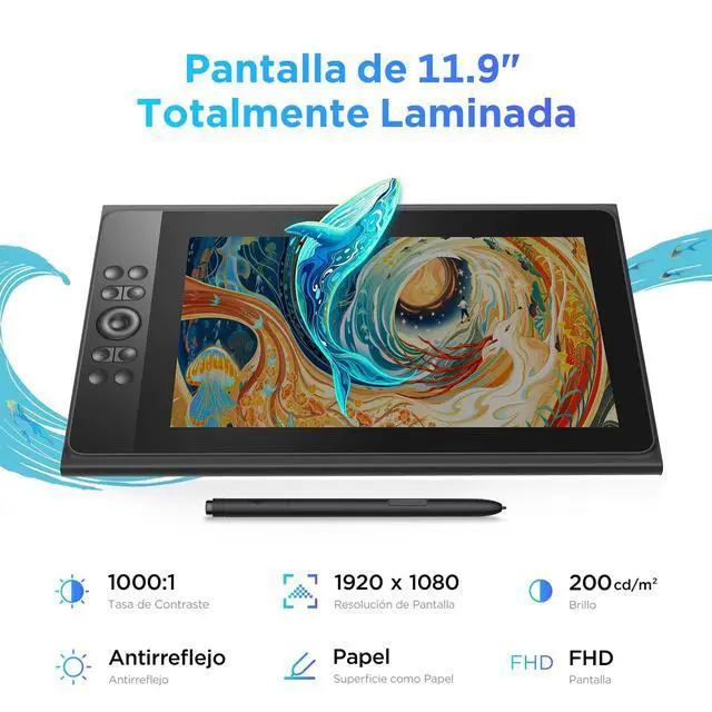 Professional Color DisplayWith an ultra-wide color gamut of 147% sRGB, every stroke comes to life in vivid hues. You can easily switch between three color spaces (sRGB, Adobe RGB, DCI-P3) for your preference, and choose the one that best suits your creative needs. The UE12 PLUS graphics tablet with display offers incredible colour coverage of up to 99%, ensuring that every shade is vibrantly displayed. ^^ Fully laminated technologyEquipped with a fully laminated and anti-glare 11.9 -inch FHD (1920*1080) screen, it reduces parallax and offers the user a better visual experience.