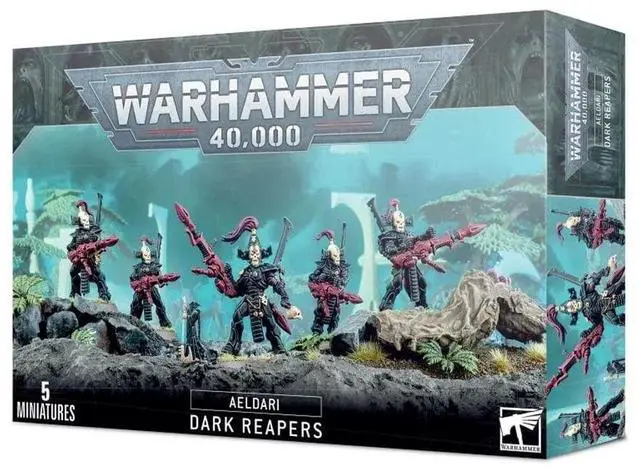 This kit builds one unit of Dark Reapers armed with reaper launchers, complete with their Exarch who can be built with a reaper launcher, shuriken cannon, aeldari missile launcher, or tempest launcher. The Exarch can be built holding a skull in their off-hand, and has a choice of four heads, while each Dark Reaper has a choice of helmeted or unhelmeted heads. Also included is a small miniature representing a Dark Reaper shrine. This set comprises 82 plastic components and is supplied with 5x Citadel 28.5 mm Round Bases and 1x Citadel 25mm Round Base.