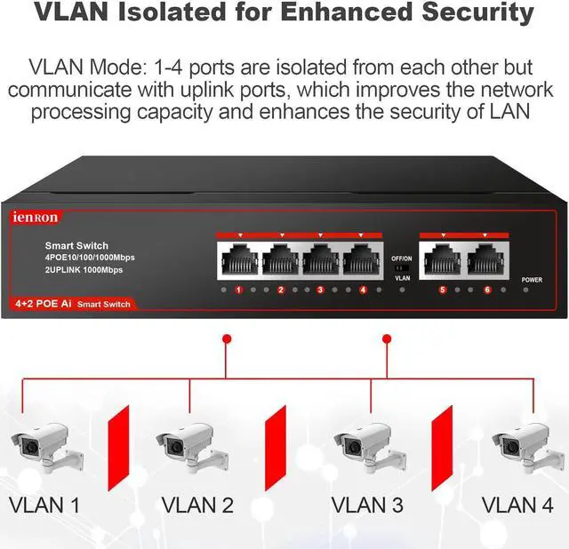 ienRone 6 Ports Gigabit Network PoE Switch with Metal Case, Black / Red