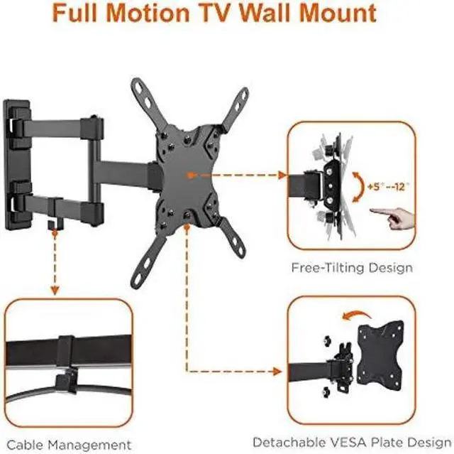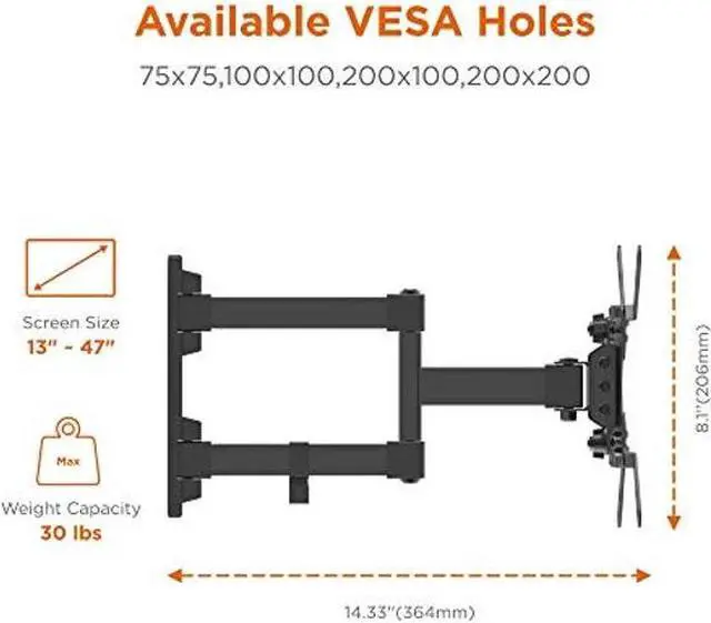 This versatile FULL-MOTION TV Wall Mount is designed to fit any 13''-47'' Flat Panel TVs up to 30 lbs. Wherever you are sitting comfortably in the room, the full-motion feature will allow you maximum flexibility to effortlessly achieve the best view angle and reduce that daylight glare off the screen. Extend your TV outward up to 14.3 inches from the wall, tilt it forwards or backwards, and/or swivel your TV left to right for easy viewing from any seat in a room! This pre-assembled arm comes complete with cable clips and decorative covers to ensure an elegant and tidy look.