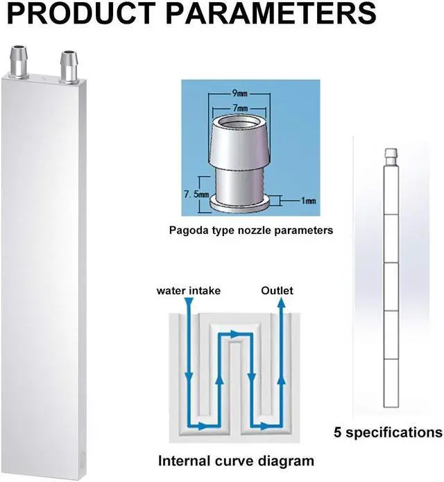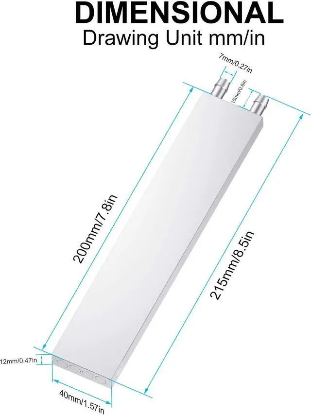 Water cooling block size: 40 x 200 x 12mm; Material: aluminum alloy.